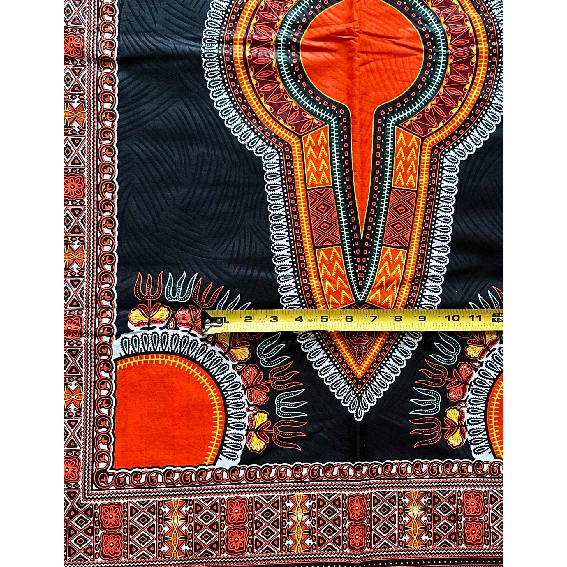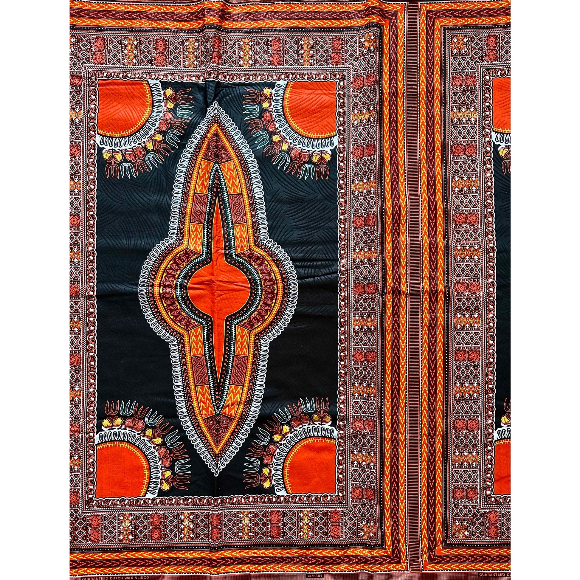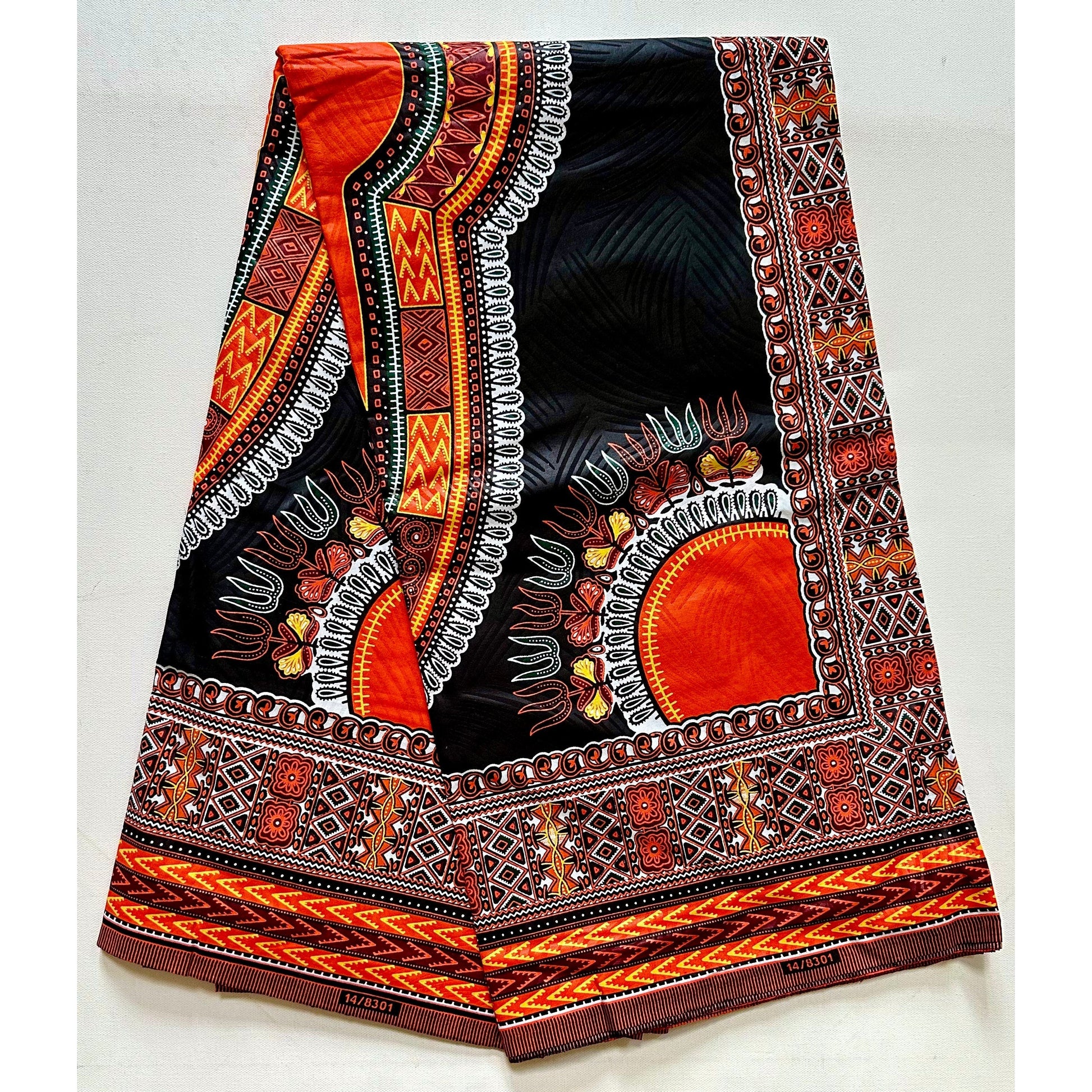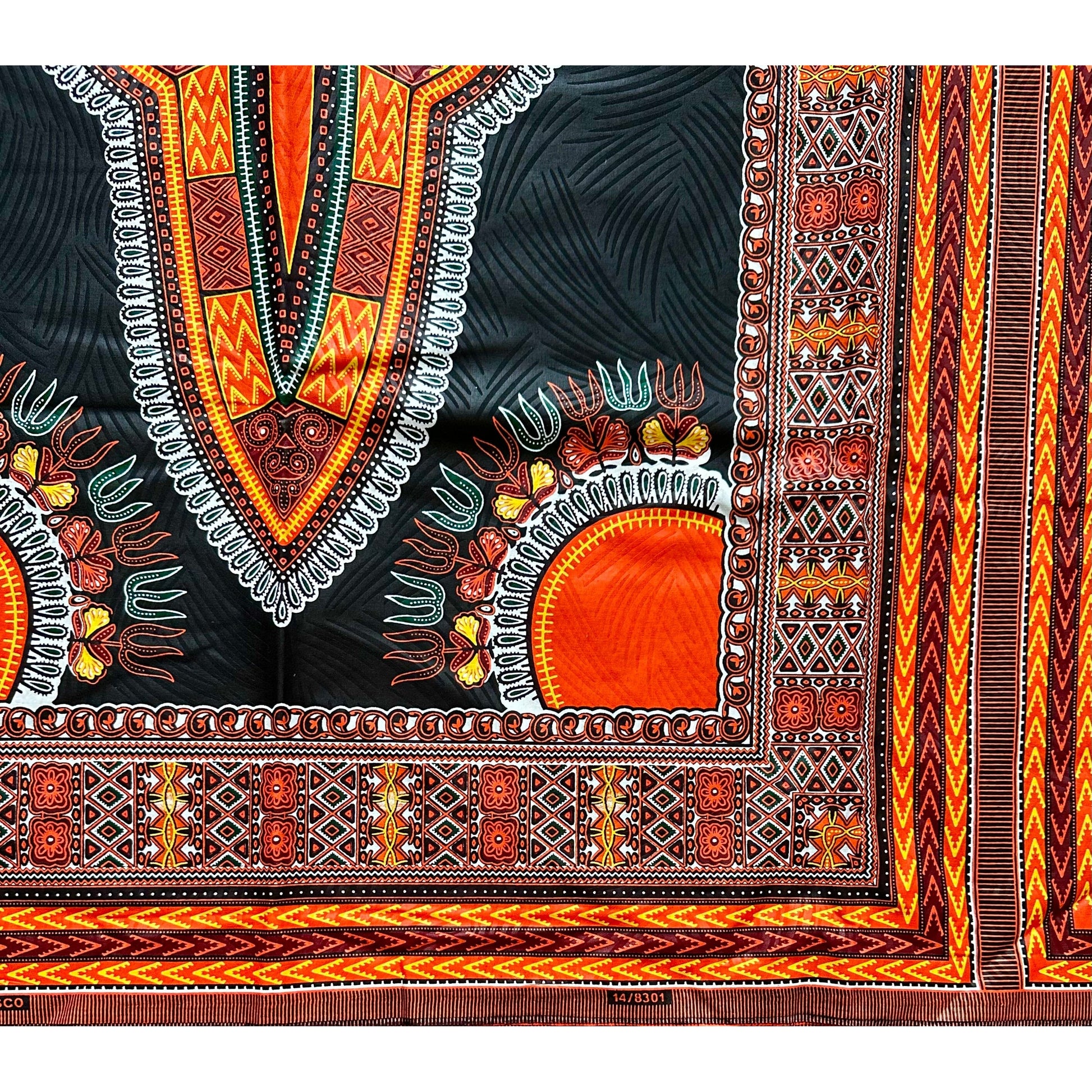 African Dashiki Print Fabric/ Ankara - Beautiful Black & Orange Design, YARD, PANEL or WHOLESALE