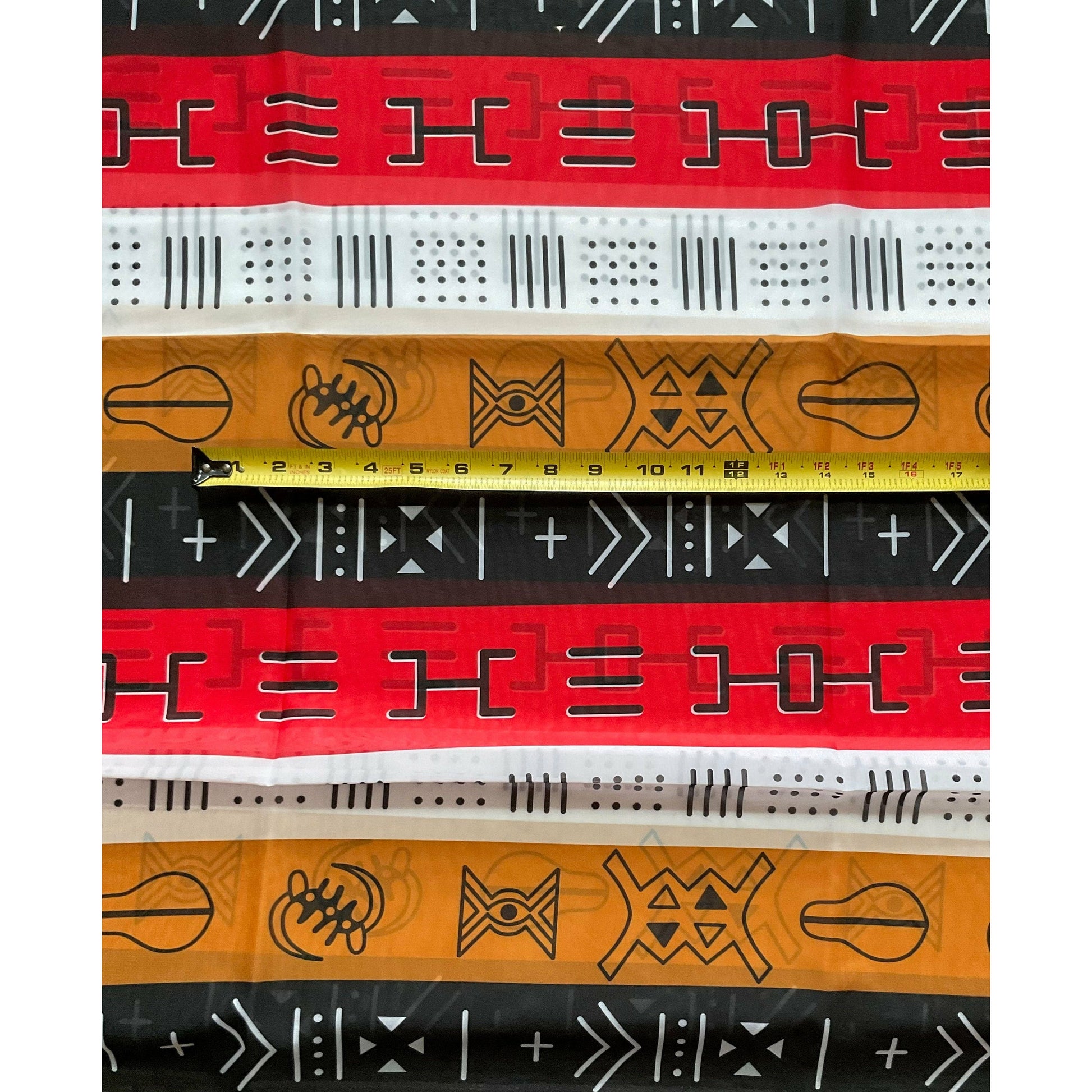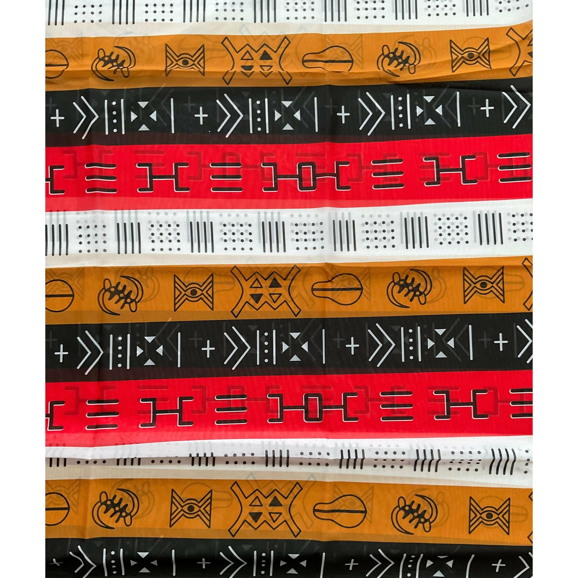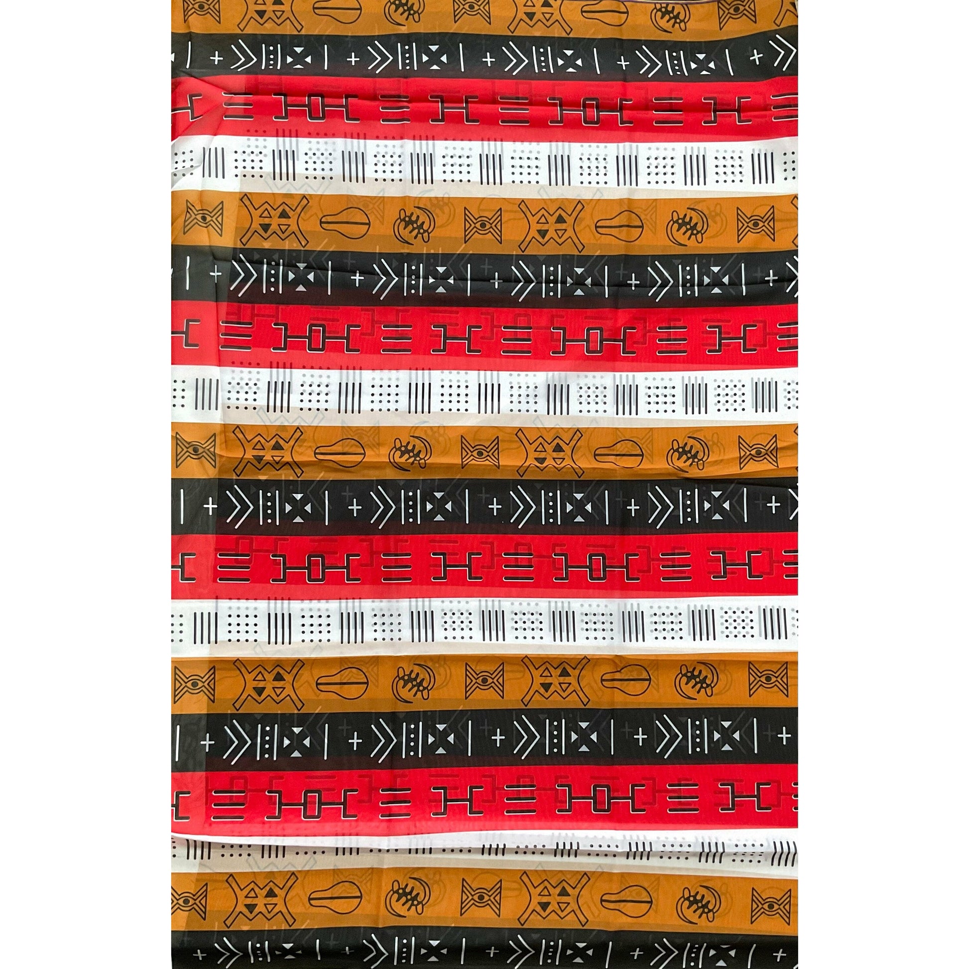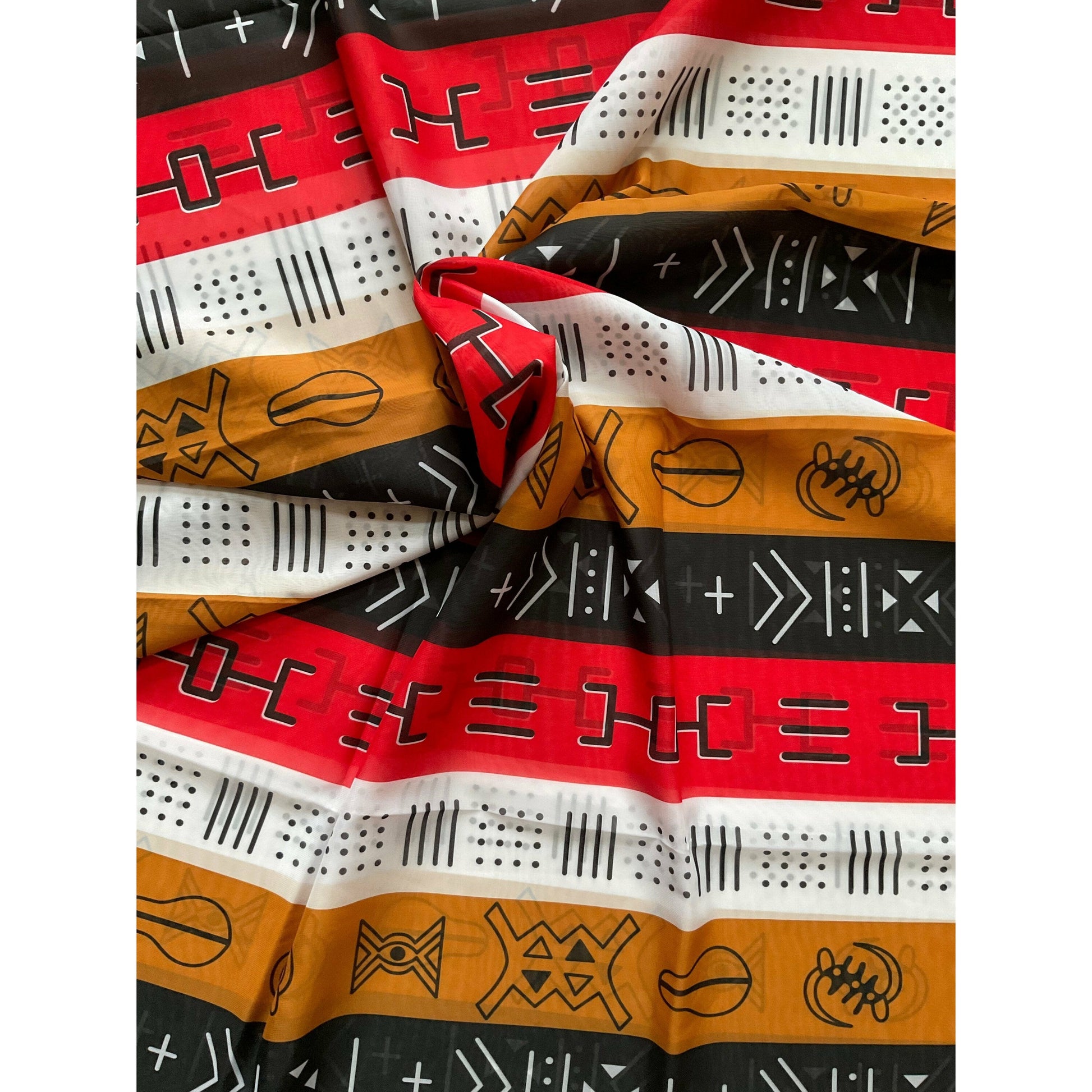 African Print, Chiffon Fabric- Black, Red, Brown, White "Duodu Rhythm", Per Yard