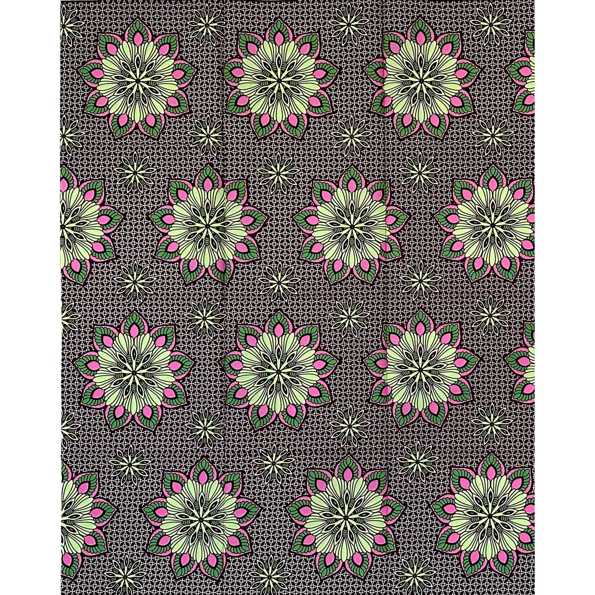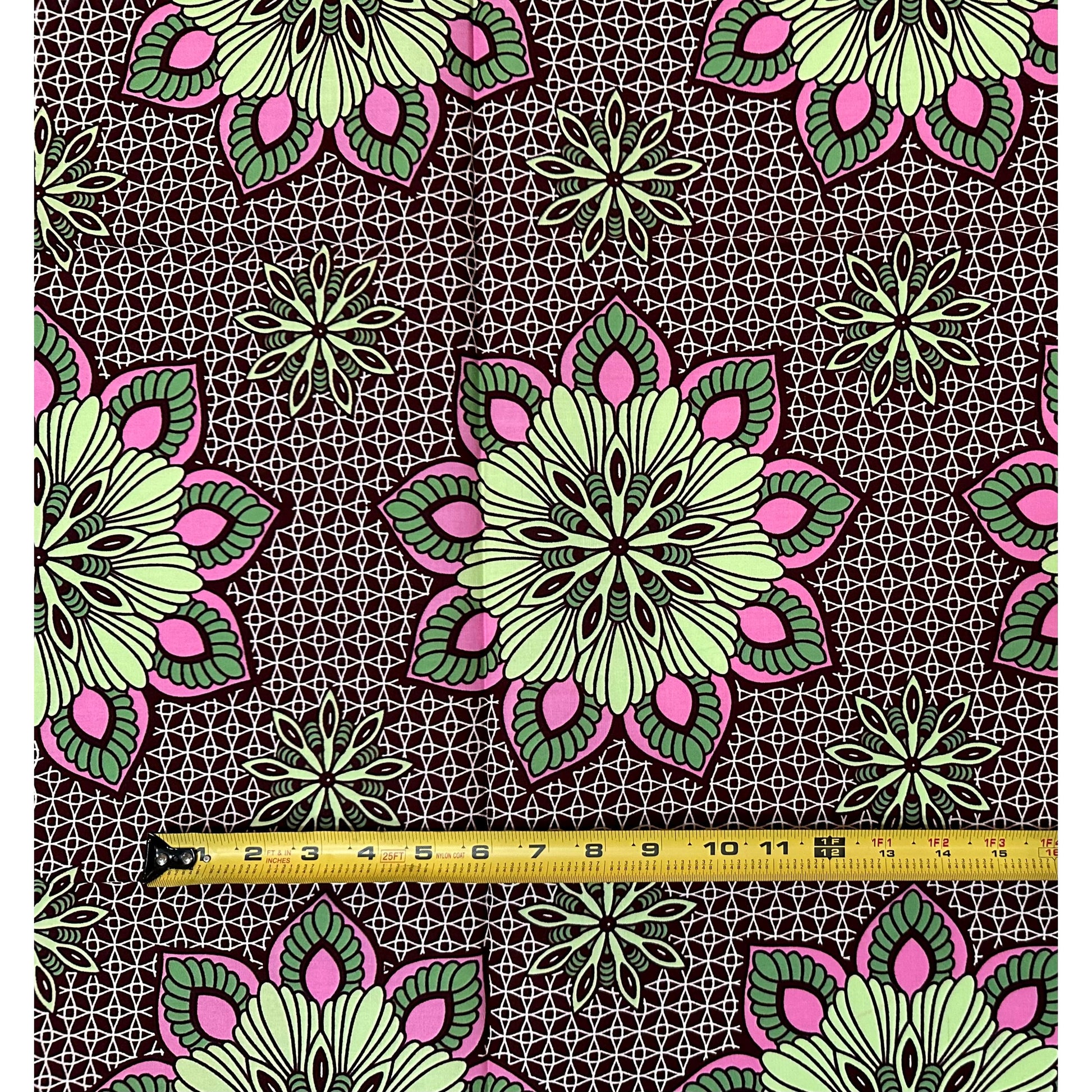 African Print Fabric/ Ankara - Brown, Green, Pink ‘Floral Mandala' Design, 1 YARD