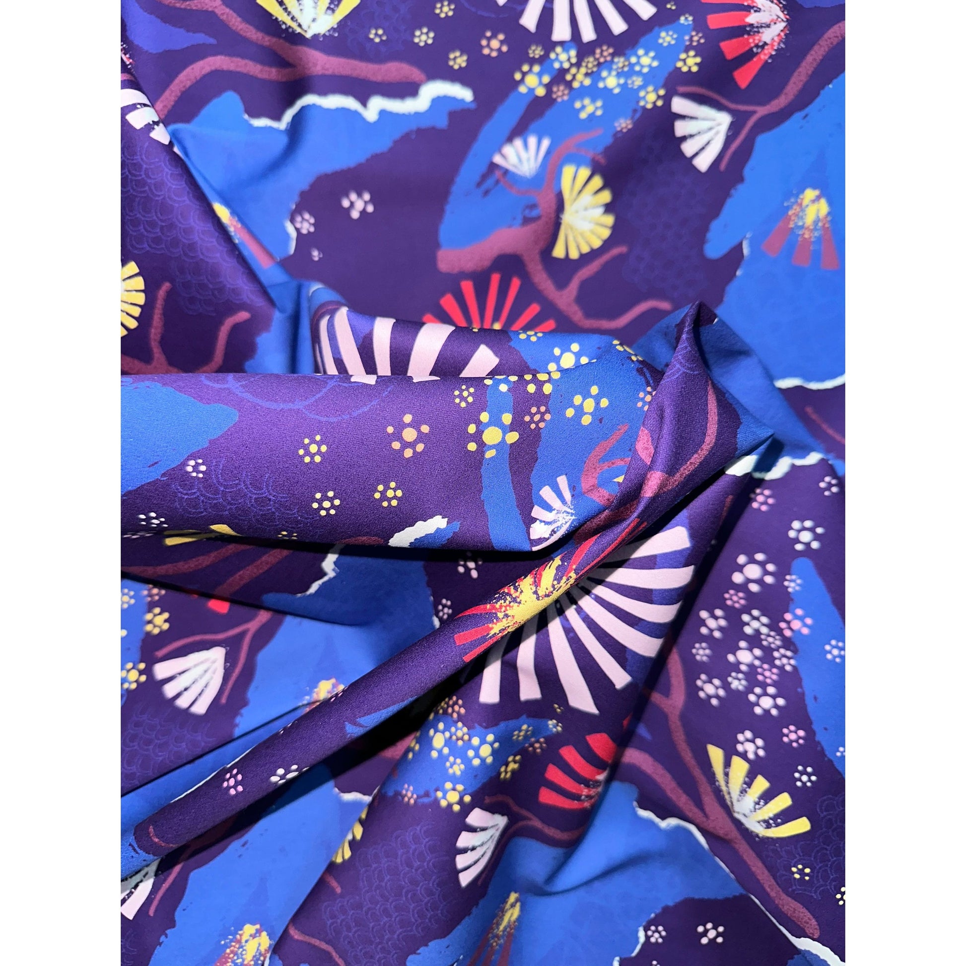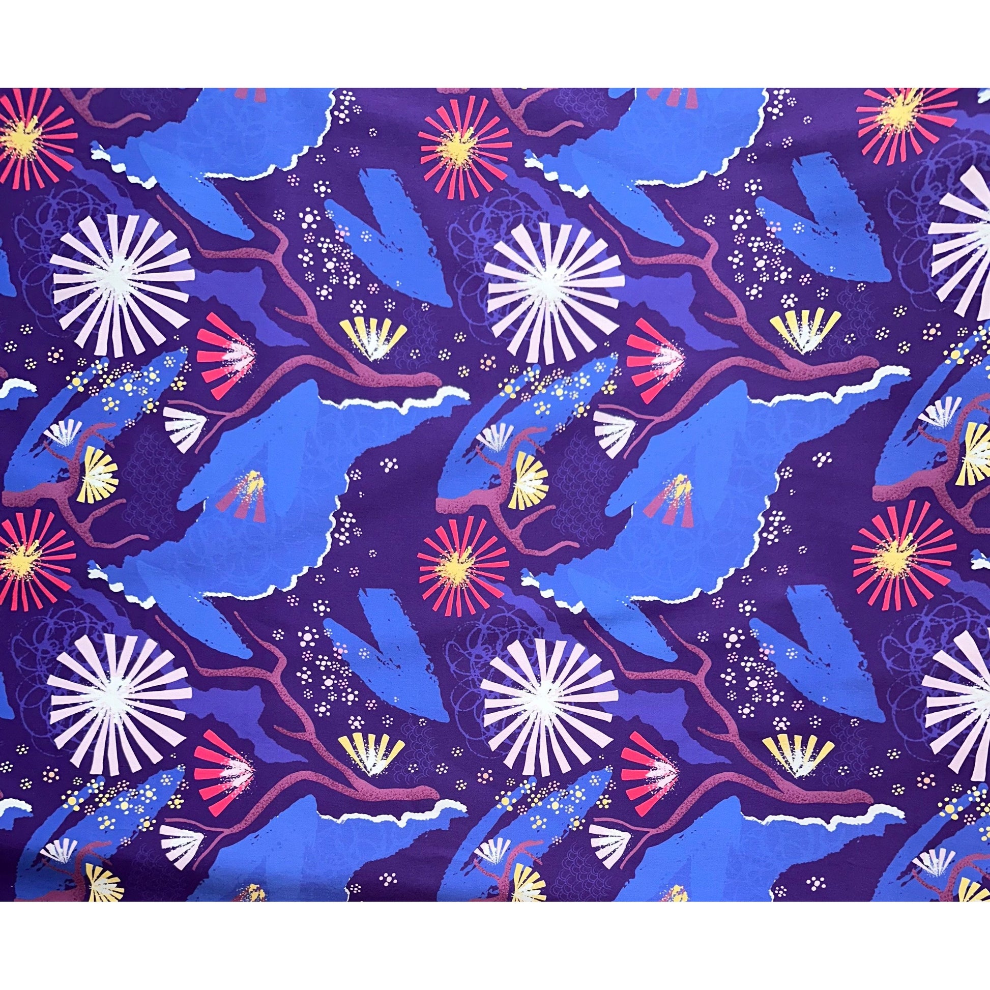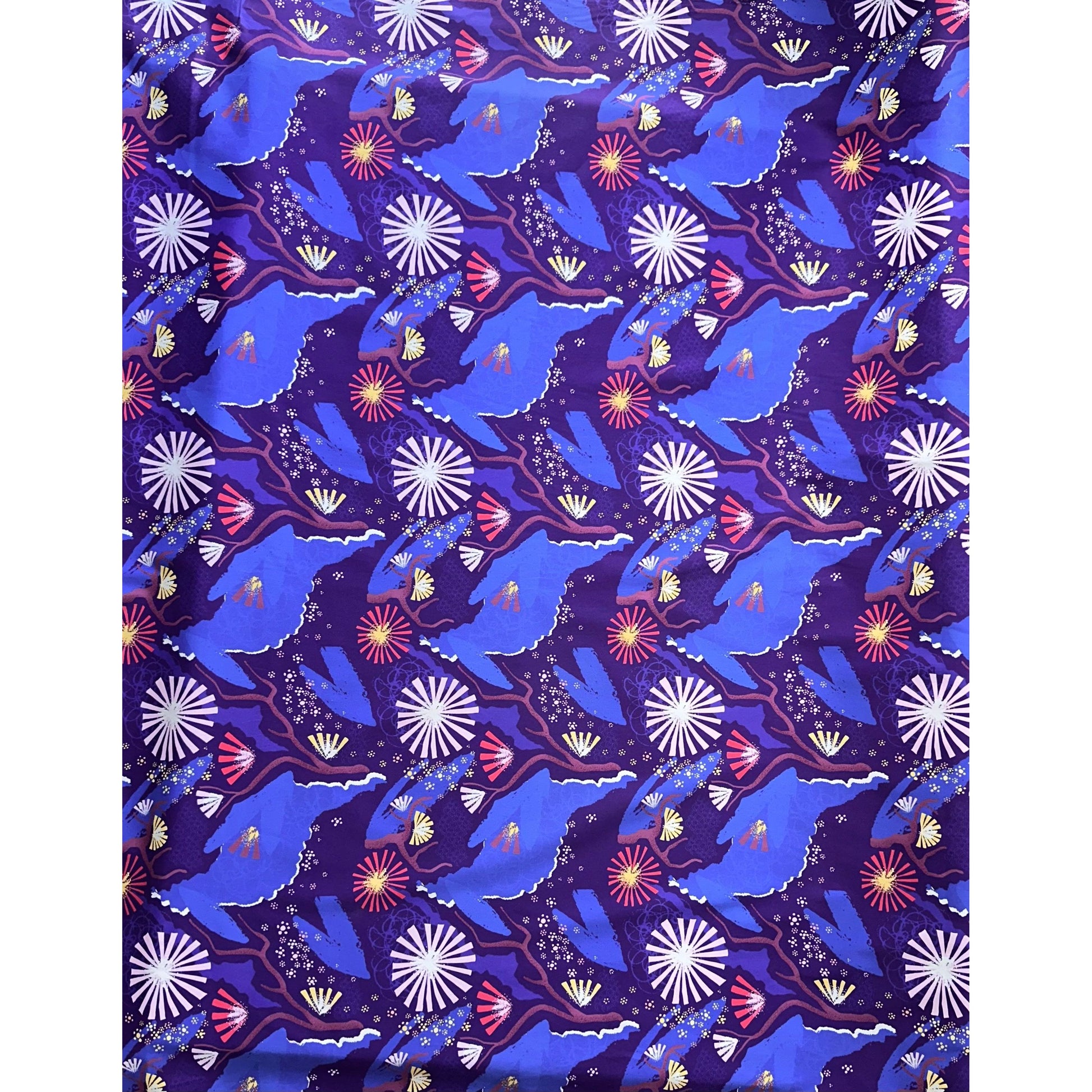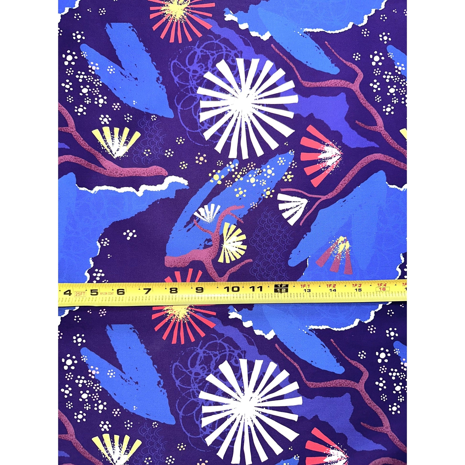 African Print, Stretch Cotton Satin Fabric- Blue, Purple, Pink "Venus Rising", Per Yard